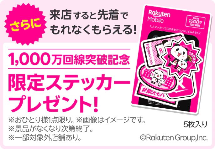 来店するだけで記念ステッカーがもらえるそうなので気になる方はお近くの楽天モバイル店舗にぜひお越しください。ちなみに、楽天モバイル紹介キャンペーンは店舗経由の申し込みにも適用可能です!最大14,000ポイントもらえるのでぜひ活用ください。
