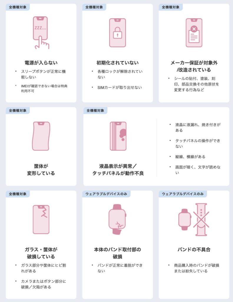これはソフトバンクの場合ですが、それ以外の各社でも上記にあるような状態では追加費用が発生する可能性が高いです。車の残価設定型プランと同じで、返却時に車が事故車になっていたり、水没させてしまったり、故意の破損をした場合は査定額が減るのと同じで、スマホの分割購入プランもあくまで返却時にスマホが正常に動作することを前提にしています。
