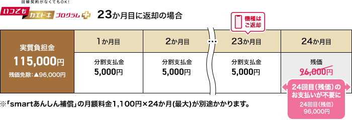 残価設定型の24回払いでスマホ端末を購入し、23ヶ月目に返却すると24回目以降の残価支払いが不要になるプラン。スマホを破損させたり、物理的に故障したりしていない限りは一括でスマホを購入するよりも安く2年間スマホを使えるお得プランです。