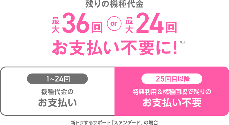 ソフトバンクの「新トクするサポート」プランで端末を48回払いで購入して、25ヶ月目以降にこの特典「新トクするサポート」を利用し、端末を返却すればそれ以降の支払いが免除されます。