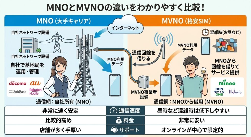 MVNOとはざっくり言えば格安SIMと呼ばれるサービスを提供する事業者のことです。大手通信キャリアよりも安価にサービスを提供できる一方で回線そのものはドコモやau回線の一部を借りる形になるので、お昼休みなど混雑する時間は回線速度が落ちたり、繋がりにくくなったりします。