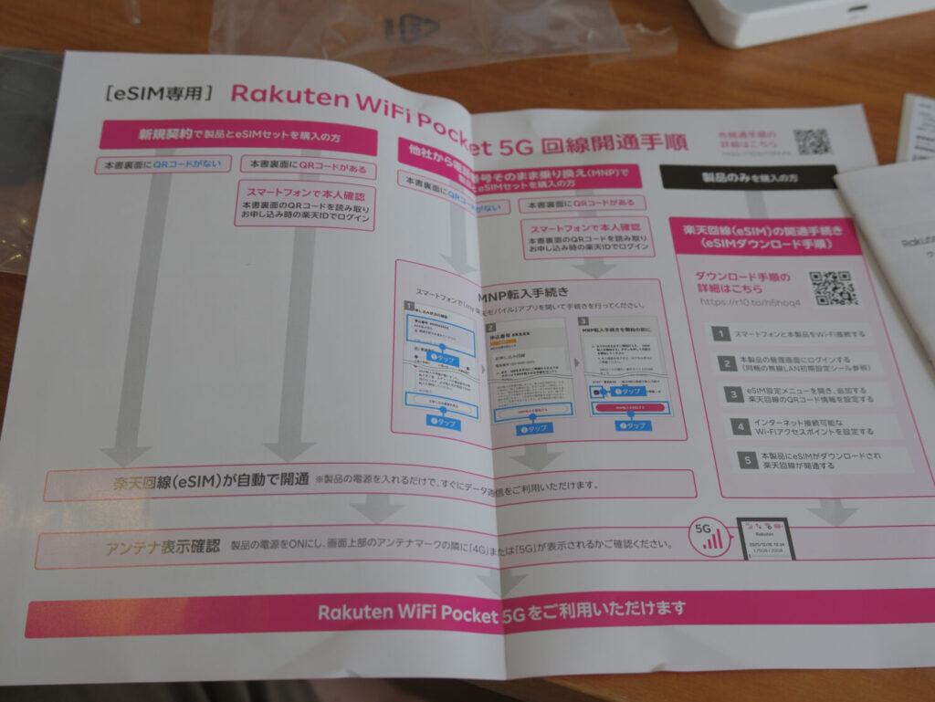 eSIM専用端末なので新たにSIMカードを指したり、プロファイルをダウンロードしたりする必要もありません。同梱されているスタートガイドに従ってあっという間に接続できました。私の場合は本来裏面にQRコードがない本人確認完了済みの状態でしたが、そうでなくても端末本体裏面にあるQRコードをスマホで読み取ってmy楽天モバイルで本人確認をするだけであっという間に開通させることが可能です。